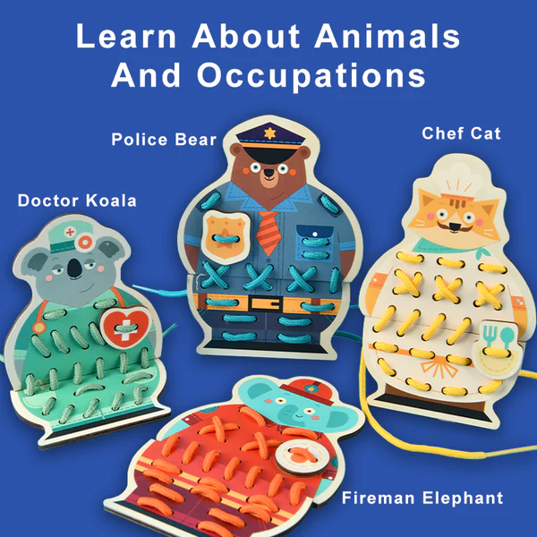 🐶 4 Character Wooden Boards – Each depicts a friendly animal with a career theme (e.g., doctor, fireman, chef, police) with pre-drilled holes for threading.