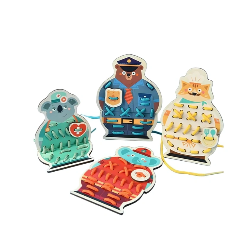 A wooden threading game set featuring multiple animal characters dressed in different professions — such as a doctor, police officer, chef, and more — each made of sturdy wooden panels with holes for lacing and threading colorful cords.
